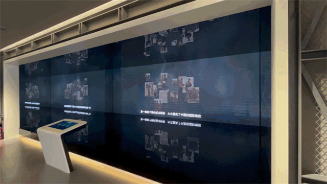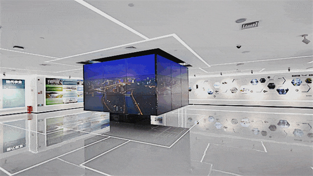 城市標識看似是將顯示屏幕一分為二,但隨著工作人員手指一動,兩側便會緩緩推出兩塊小屏幕,繼而形成一整塊大屏,為參觀者提供了一份絕佳的觀影體驗。