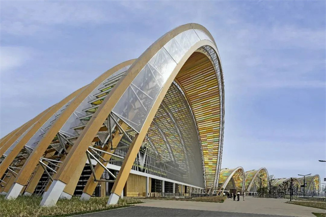建筑選用了負碳材料膠合木作為棚架的主要結(jié)構(gòu)材料,輕質(zhì)炫彩的ETFE膜材作為主要圍護材料,這兩者的融合運用為天府大地增色添彩。