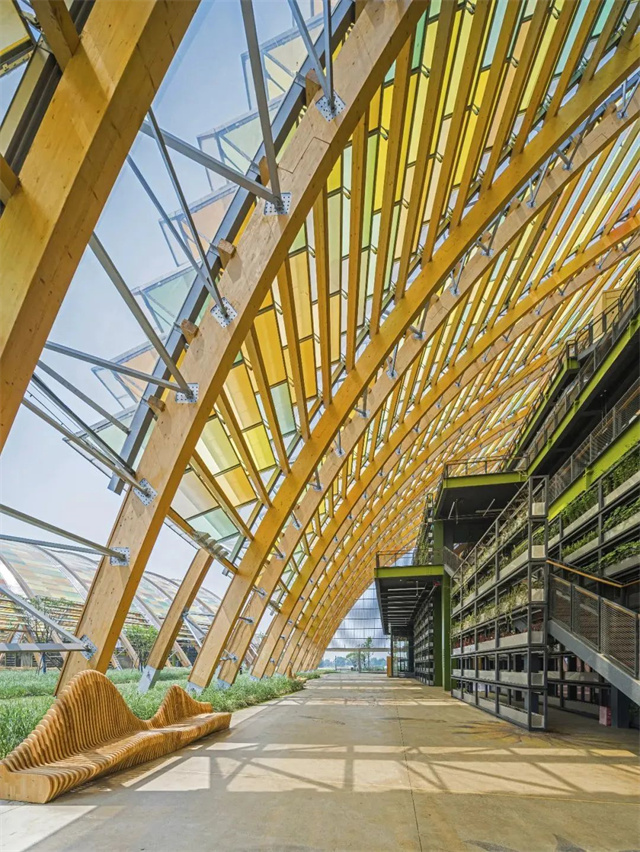 農(nóng)博會主展館由5組巨型木構(gòu)棚撐架,宛若道道飛虹,與廣袤的田野尺度相稱,高低起伏、空透輕巧。指狀開放的布局讓建筑與大田交織相融,室內(nèi)復合化的會議、會展、商業(yè)、孵化等功能區(qū)給建筑的使用提供了多種可能。